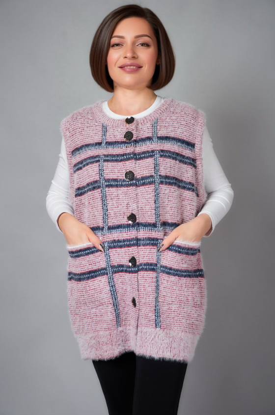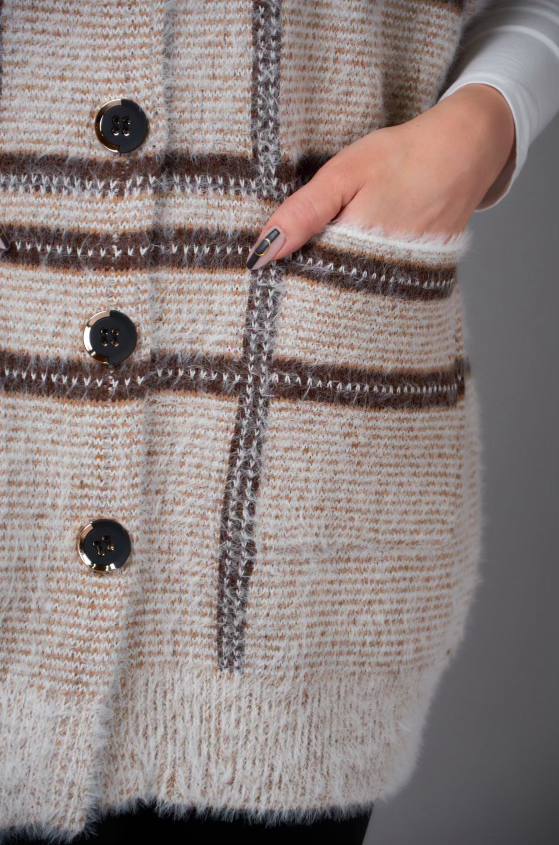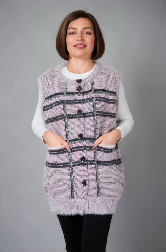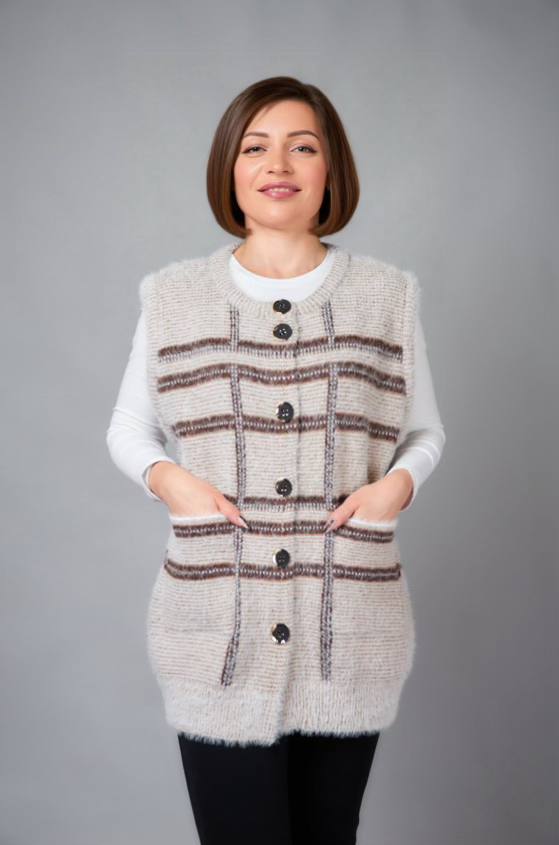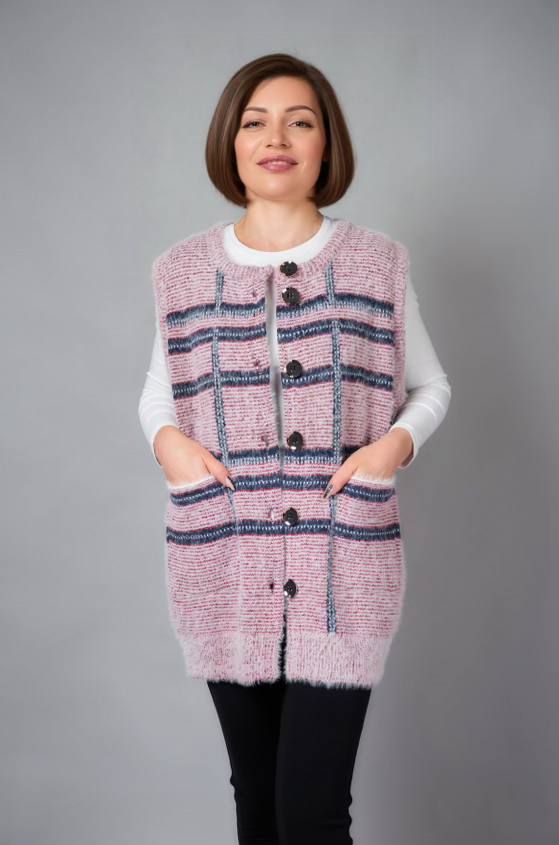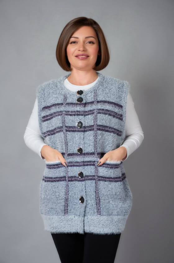 Жіноча в’язана жилетка на ґудзиках — це стильний і затишний вибір, який додає образу шарму та комфорту. Виготовлена з м'якої, якісної пряжі, жилетка забезпечує тепло, не обтяжуючи ваш образ. Ґудзики надають їй класичного вигляду, роблячи її універсальною річчю, яка підходить як для повсякденного носіння, так і для більш елегантних випадків. Такий виріб чудово доповнює блузи, сорочки або легкі светри, створюючи багатошаровий і стильний образ.